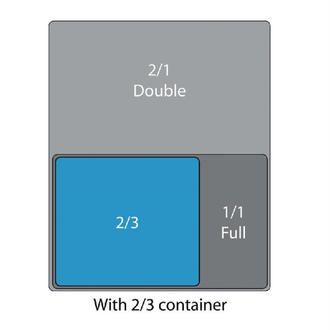 354 x 325 mm.20 mm di profondità (1,35 litri) Dimensioni: 325 x 354 mm.Materiale: acciaio inossidabileGastronorm 2/3