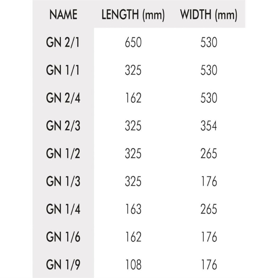 265 x 162 mm. GN 1/4. 150 mm di profondità. Contenuto: 4 litri Capacità: 4 litri Dimensioni: 150 (h) x 265 (b) x 162 (d) mm Materiale: acciaio inossidabile Gastronorm per la massima capacità Pesante Materiale dello spessore: 0.8mm / 20 gauge