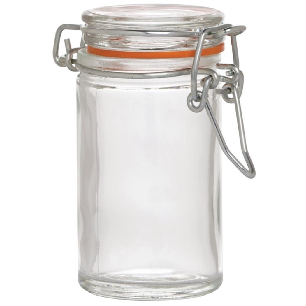 Mini barattolo con chiusura a clip e guarnizione in gomma.