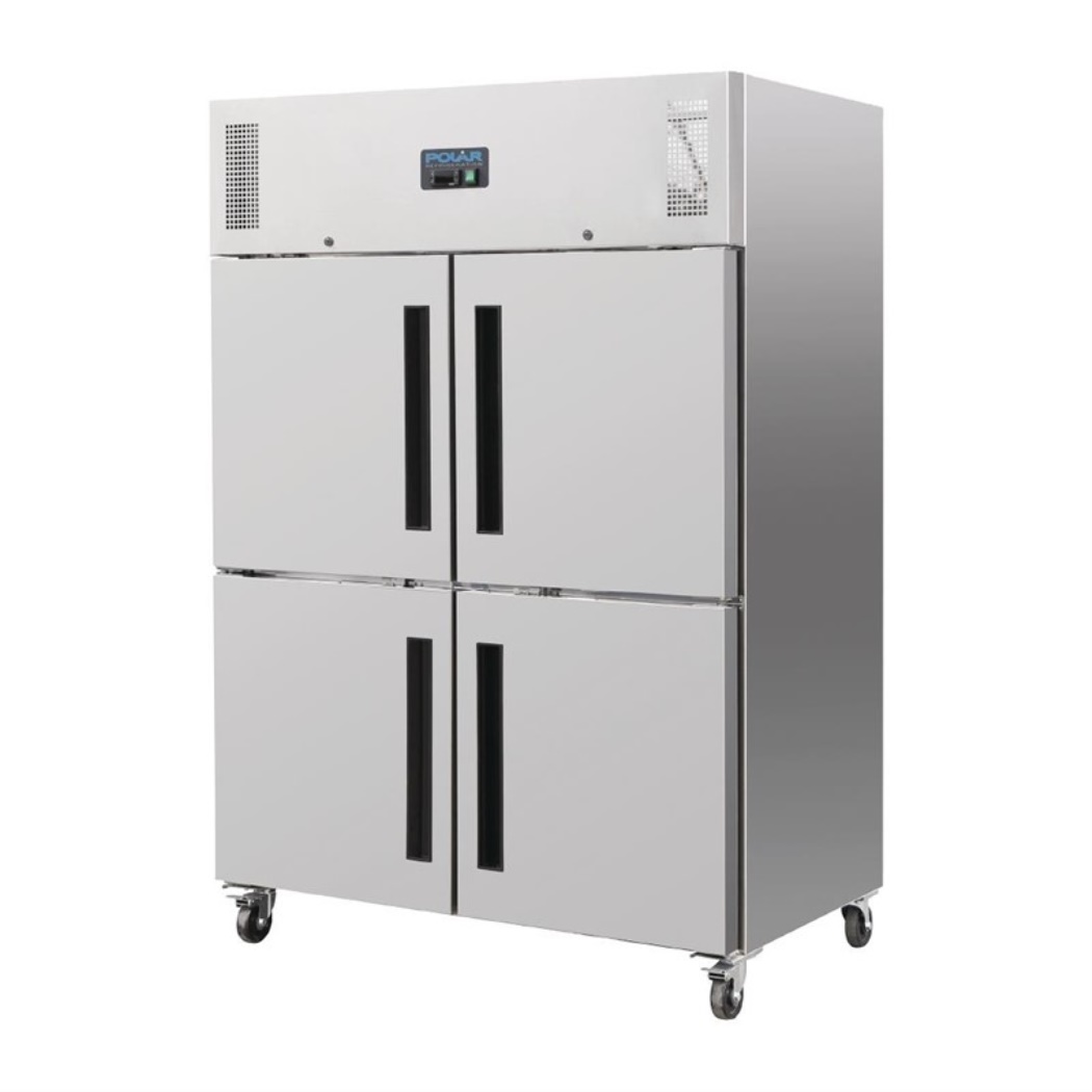 Raffreddamento e congelatore con doppie porte condivise. Posizionando i prodotti che vengono regolarmente utilizzati nella parte superiore e aprendo solo la parte superiore della porta, l'intero raffreddamento / congelatore viene ripristinato alla temperatura corretta. Per uso commerciale medio-leggero. Con ruote frenate.