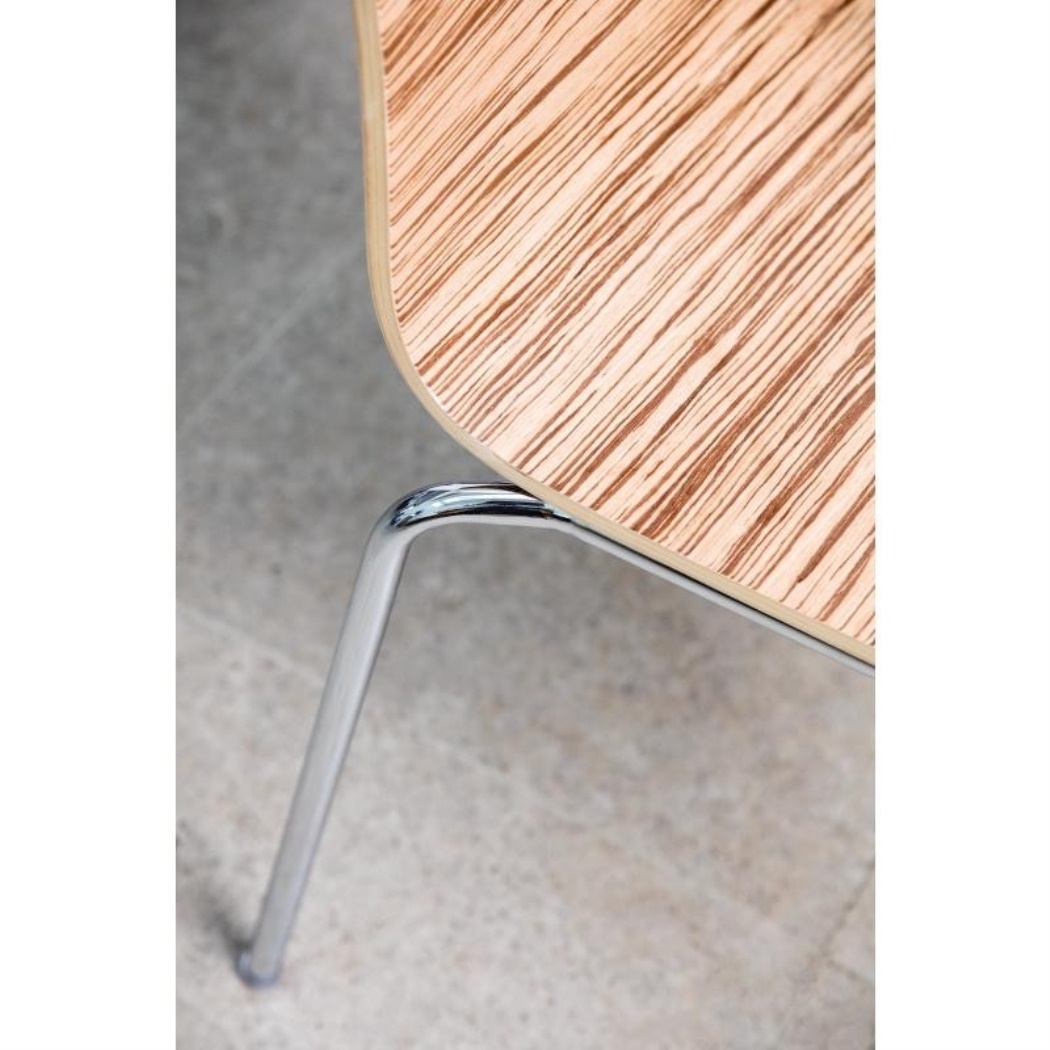 Struttura in acciaio cromato. Sedile in faggio. Altezza del sedile: 46 cm. Impilabile.Materiale: impiallacciatura di faggio e acciaio cromato