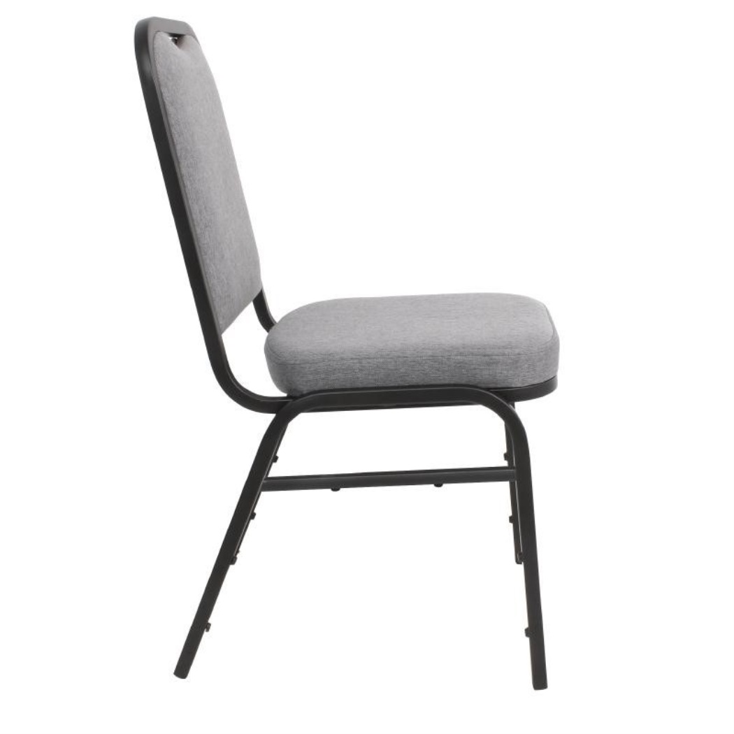 Sedie moderne per banchetti, adatte per feste o conferenze. La tappezzeria grigio neutro in combinazione con una cornice nera si adatta a qualsiasi interno.