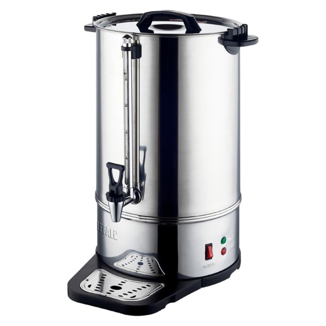 Percolatore con grande capacit?, buono per 100 tazze. Dotato di un resistente filtro in acciaio inossidabile e coperchio di ventilazione con blocco di sicurezza.