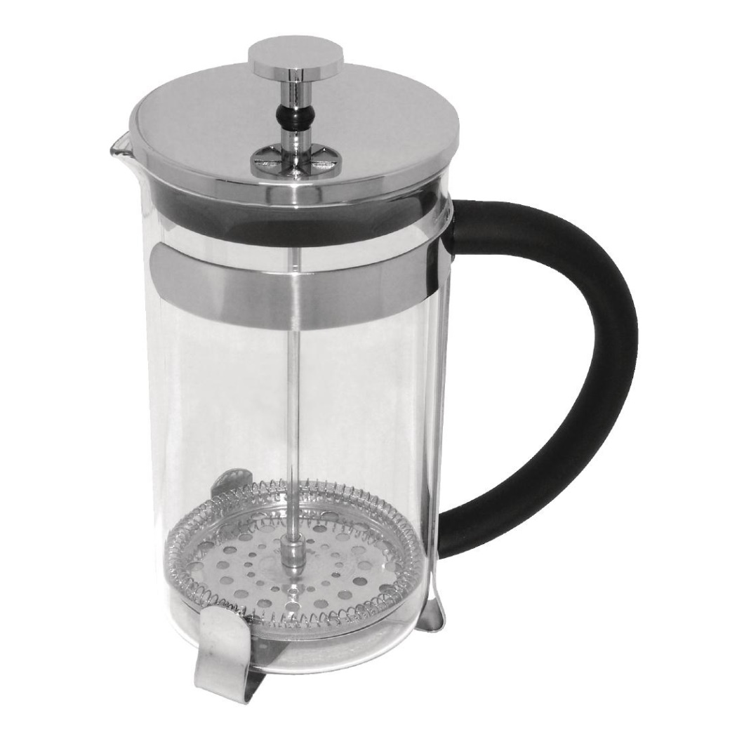 Caffettiera contemporanea in acciaio inox con vetro resistente.