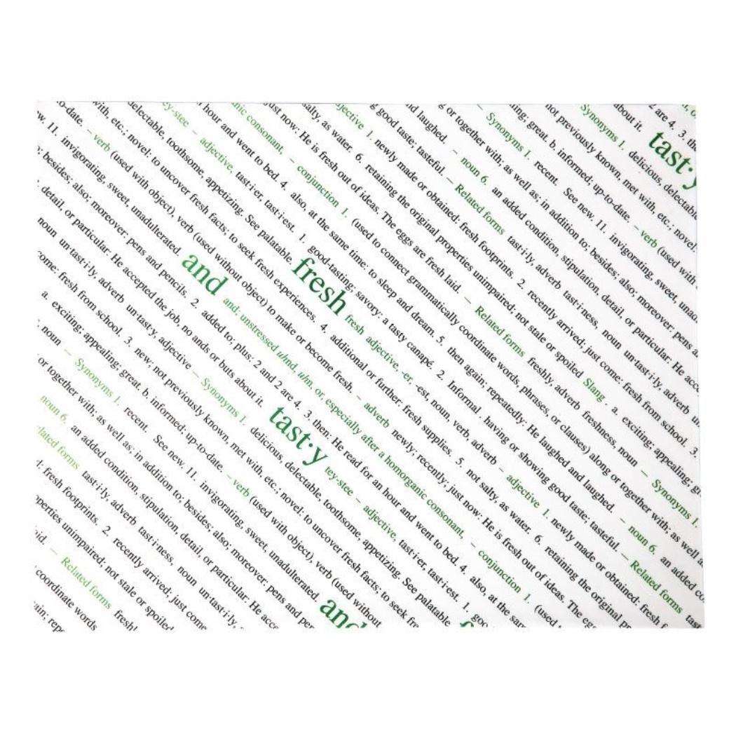 Carta oleata ecologica per la presentazione di cibi fritti e fritti.25,5 x 20,3 cmDimensioni: 25,5 x 20,3 cmStampa moderna con testoPerfetto per i ristoranti (fast food)Unità di imballaggio: 500 pezzi