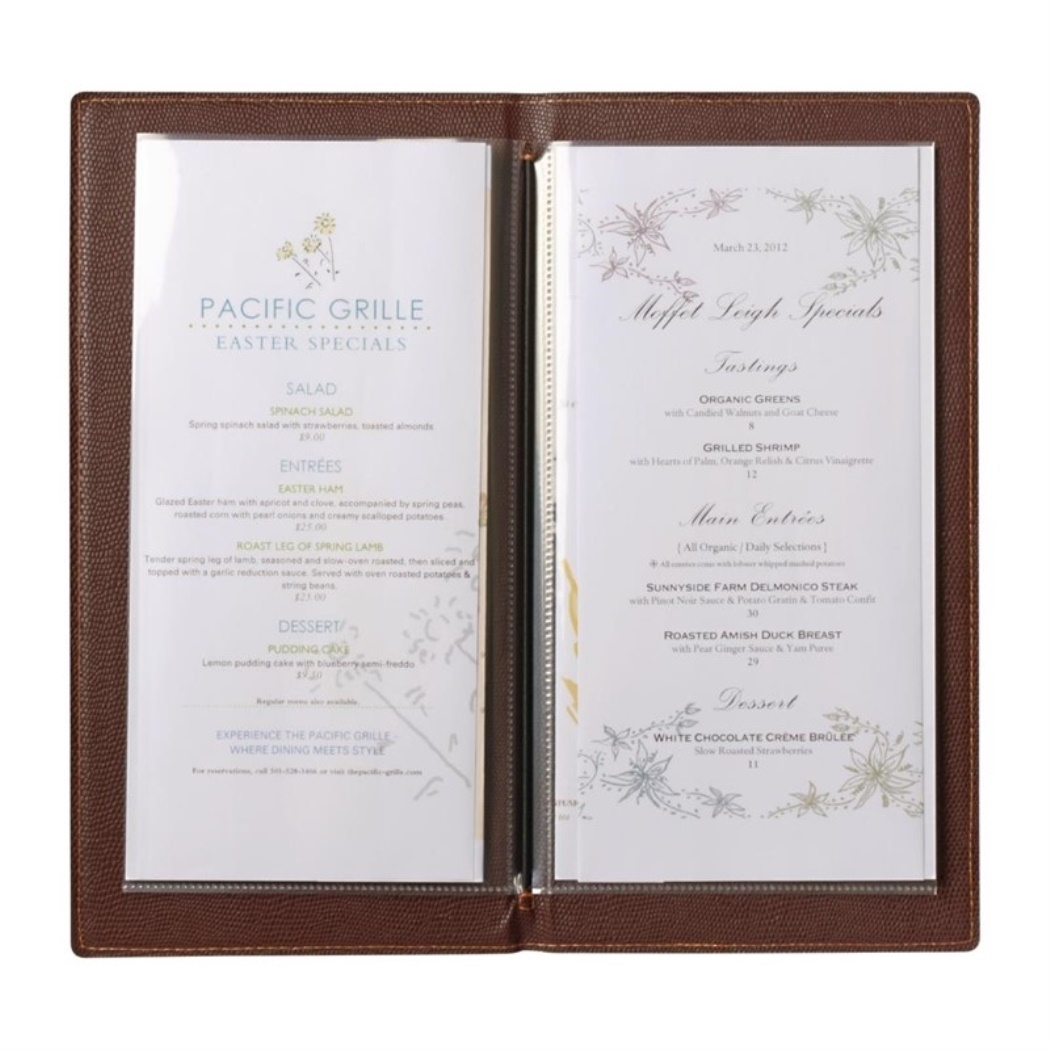 Collezione di contenitori per menu contemporanei disponibili in vari colori e dimensioni. Realizzato in morbida pelle sintetica, antigraffio e lavabile con acqua e sapone. Dotato di una copertina con quattro pagine back to back. Vino rosso A5.