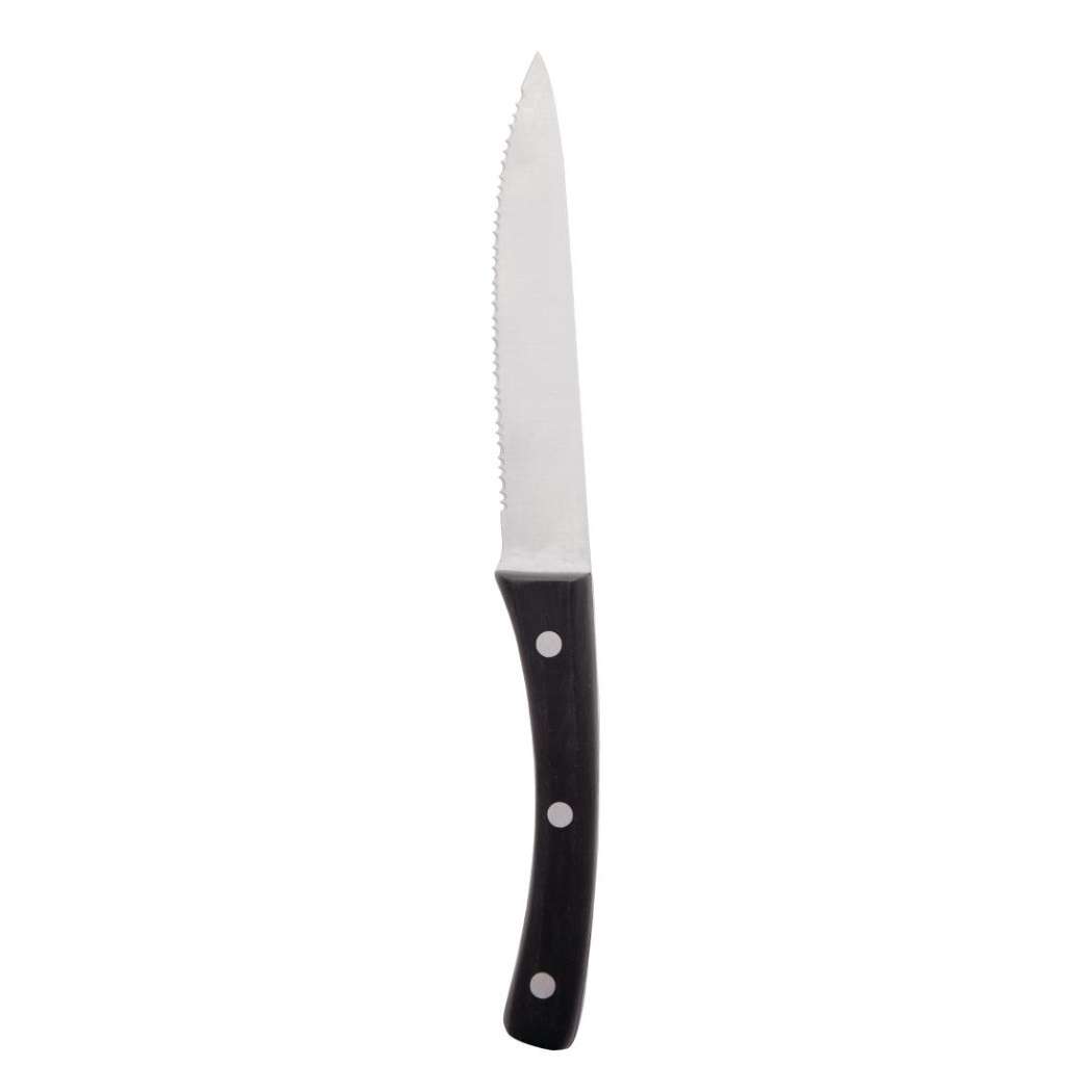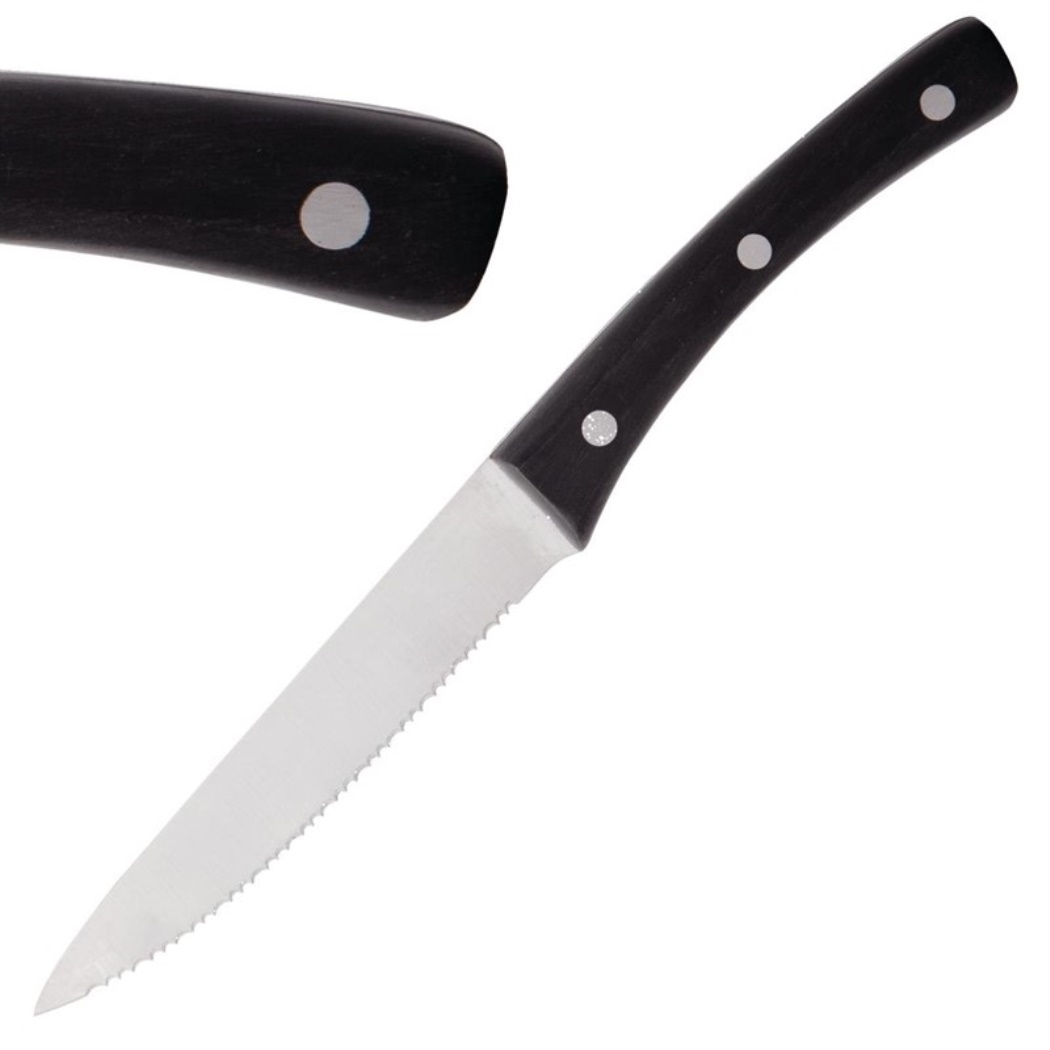 Un classico coltello da bistecca con un tocco moderno, la lama è in acciaio inossidabile e il coltello ha una maniglia curva e rivettata. Lavabile in lavastoviglie 23 centimetri.