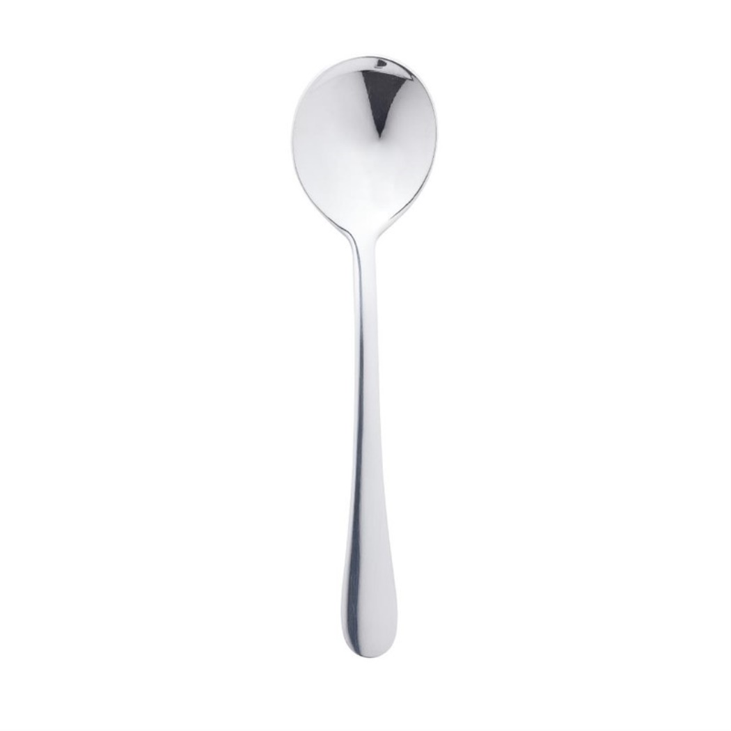 Acciaio inossidabile 18/0 ad alta lucidatura con angoli arrotondati all'estremità dell'impugnatura. Prezzo e imballaggio per 12 pezzi. Buckingham, cucchiaio da minestra. Prezzo per 12 pezzi.