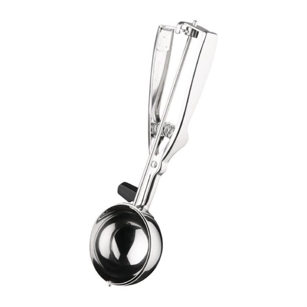 Cucchiaio per porzionatura in acciaio inossidabile di alta qualità. 50 porzioni per litro. Con molla robusta Dimensioni: 3,9 (Ø) cm Materiale: acciaio inossidabile Adatto a tutti i tipi di cibo Ideale per porzionatura