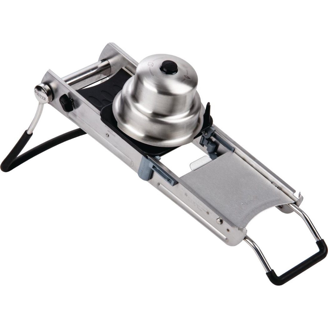 Mandolino con lama di santoku per una maggiore praticit? di taglio grazie alla superficie scanalata e alla pressa ergonomica in acciaio inossidabile. Piastra superiore dotata di rivestimento per un migliore movimento di taglio e due tappi in acciaio inossidabile per evitare lo scivolamento delle gambe. 1 x doppia lama e 3 x Julienne. 39 (1) x 18 (b) cm. Acciaio inossidabile