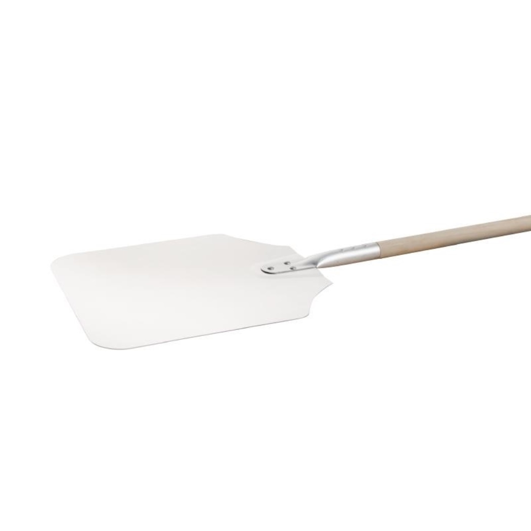 Scoop per facilitare l'inserimento e la rimozione delle pizze dai forni caldi. Piccolo: gambo in alluminio e foglia 23x15 cm. Medio e grande: manico in legno e foglia 30x30 cm.