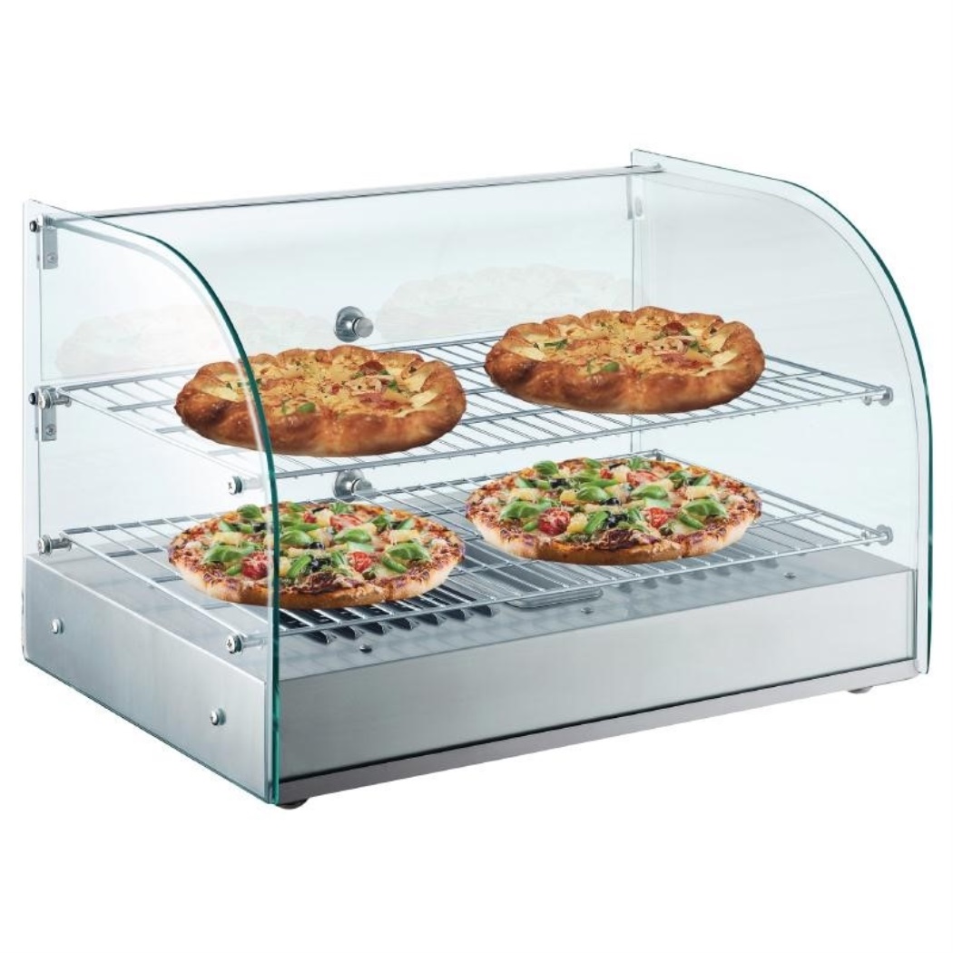 Armadio riscaldante da tavolo con vetro sui quattro lati e frontale in vetro curvato. La porta a battente sul retro rende questo display ideale per la visualizzazione frontale di torte calde o altri tipi di snack. Temperatura regolabile da 30 ? a 90 ? C.