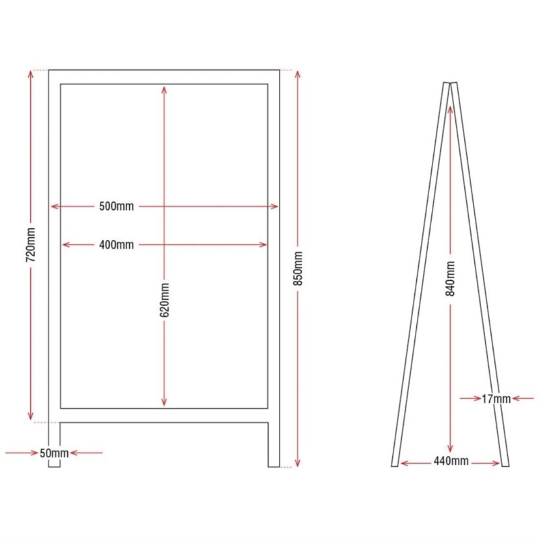 Robuste tavole di legno sul marciapiede con lavagne in melamina facili da pulire. Ideale per ristoranti, caffè e terrazze per dare l'attenzione alle offerte giornaliere. 50x85cm. Dimensioni: 50 (h) x 85 (b) cm