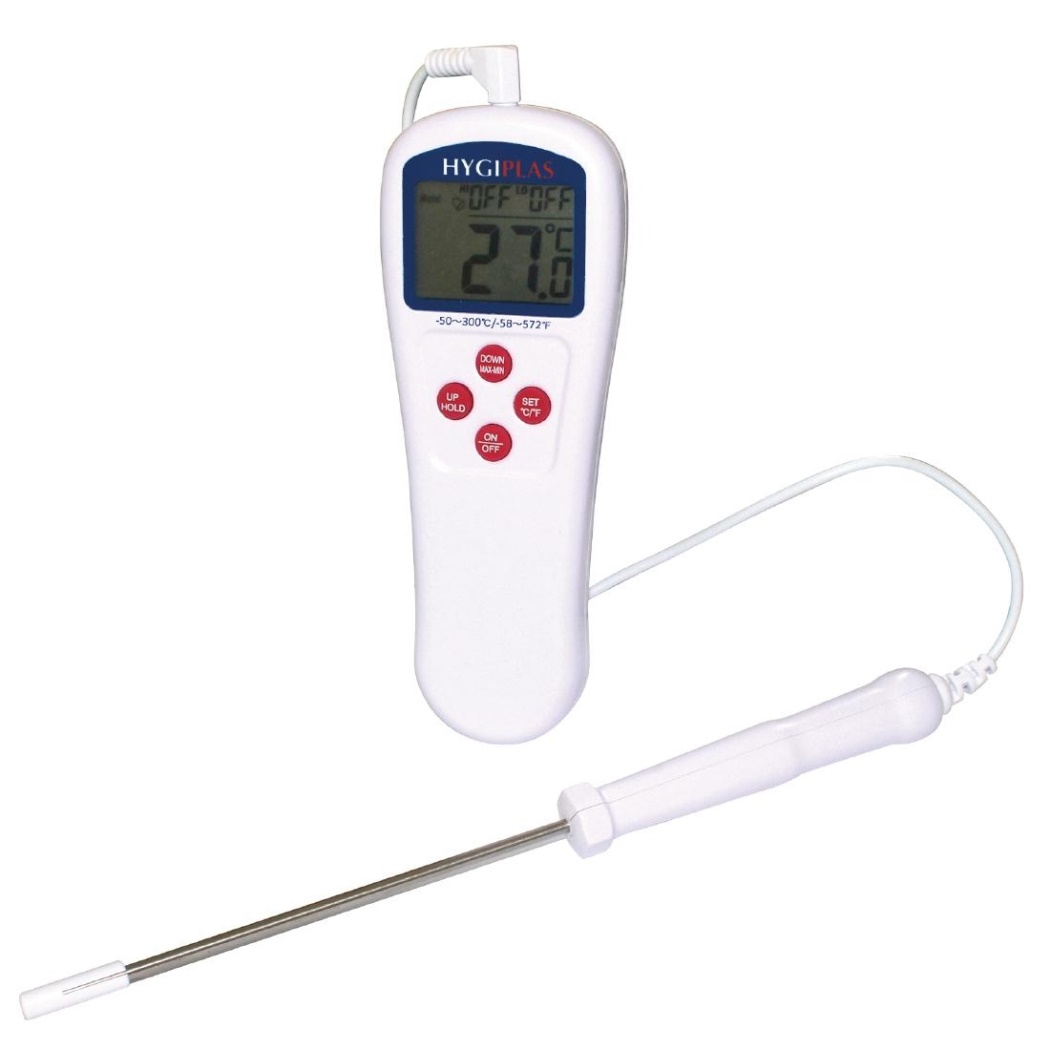 Termometro digitale professionale con ampio display LCD e circuito di spegnimento automatico. Funziona con una batteria AAA (2 x in dotazione). Sensore rimovibile in acciaio inossidabile.