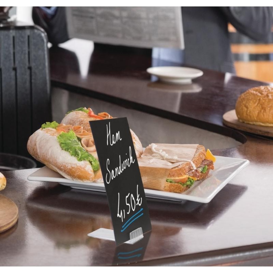 Mini etichette lavagna per l'etichettatura degli alimenti a presentazione, tavoli o premi. Fornito con quattro bastoncini, due supporti e una penna a gesso liquido.