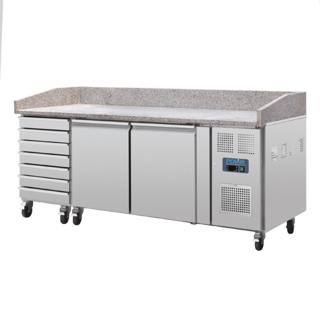 Banchi da lavoro robusti e resistenti con piano di lavoro in marmo. Ideale per stendere la pasta per pizza. I compartimenti refrigerati mantengono freschi gli ingredienti.