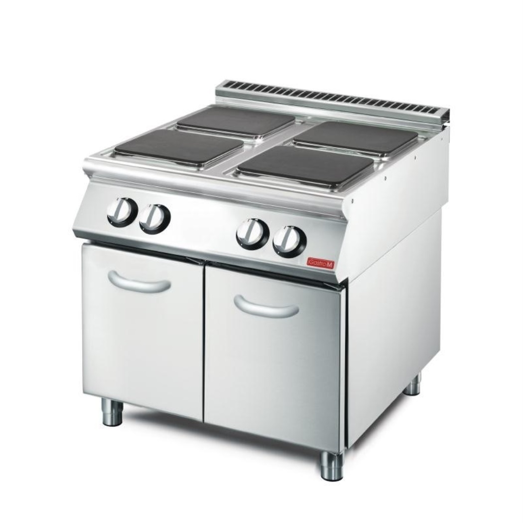 Piano di cottura elettrico con quattro piani di cottura pesanti. Ogni piastra ha un termostato indipendente impostato con le robuste manopole rotanti. Ha una spia che indica quando l'apparecchio è caldo. Consegnato senza una porta.