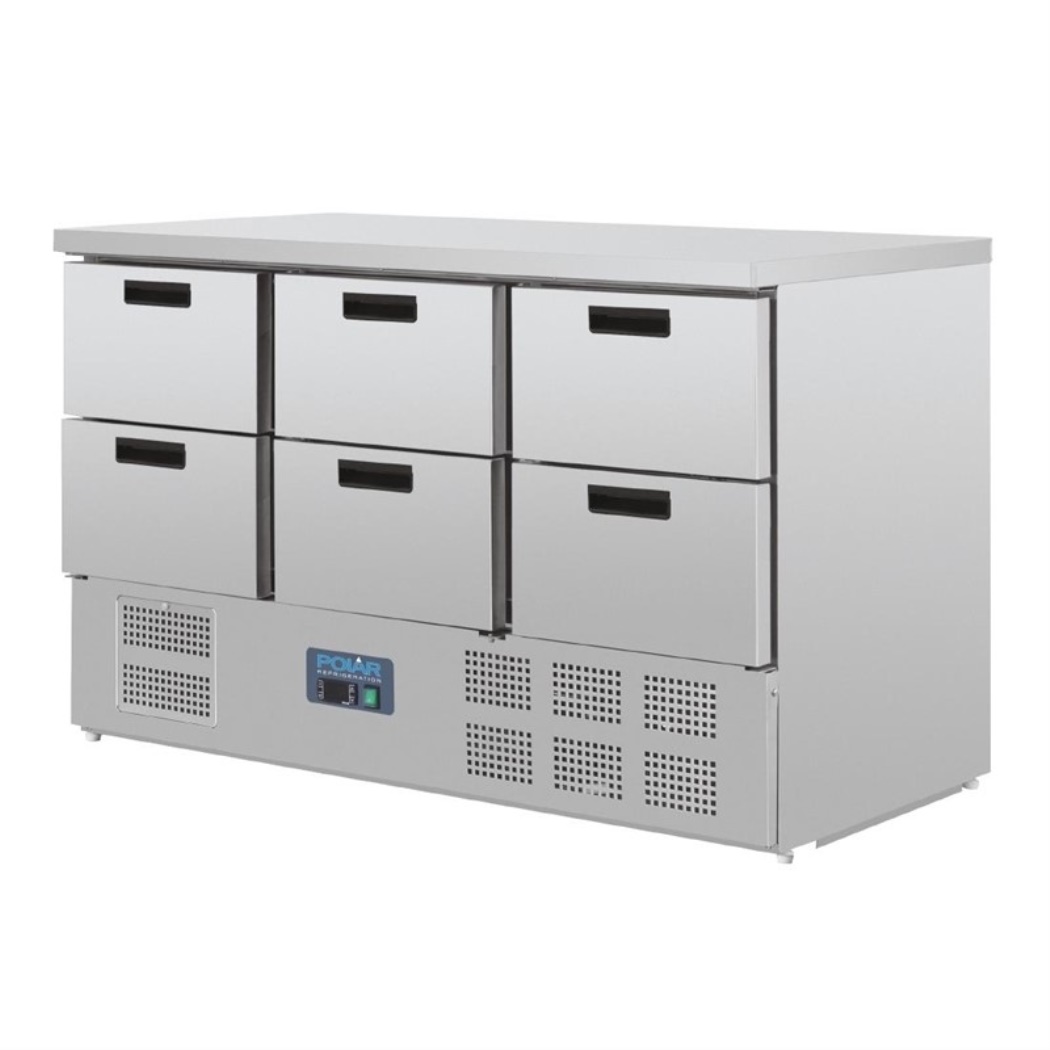 Saladette refrigerata funzionale, pratica e affidabile con sistema di raffreddamento della ventola e controller digitale. Dotato di 6 cassetti adatti per GN 1/1.