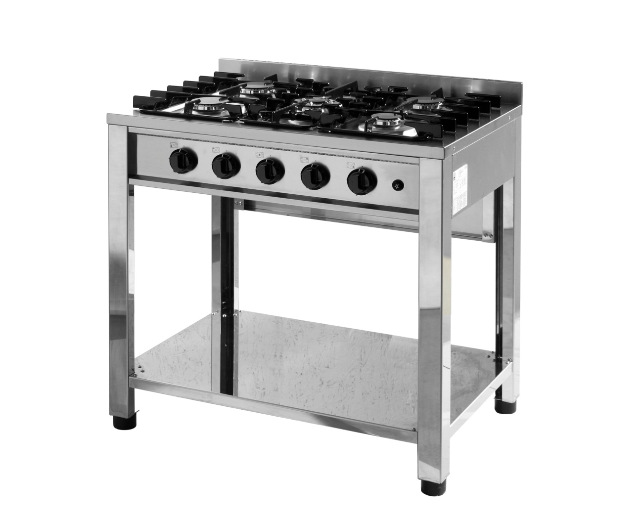 Adatto per gas naturale. Il kit di conversione per gas propano è incluso. 3 bruciatori da 3,0 kW. 1 bruciatore a risparmio energetico 1,8 kW. 1 bruciatore per wok da 3,5 kW. Con accensione elettronica e termocoppie. Supporti per pentole in ghisa in tre parti. Acciaio inossidabile