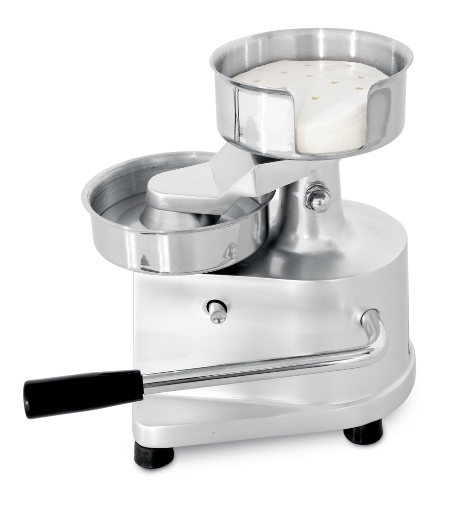 Pressa per hamburger. I componenti a contatto con la carne sono in acciaio inossidabile. Struttura in alluminio anodizzato. Comoda leva per la rimozione di hamburger preparati dalla pressa. Contenitore per divisori. Acciaio inox. Alluminio.