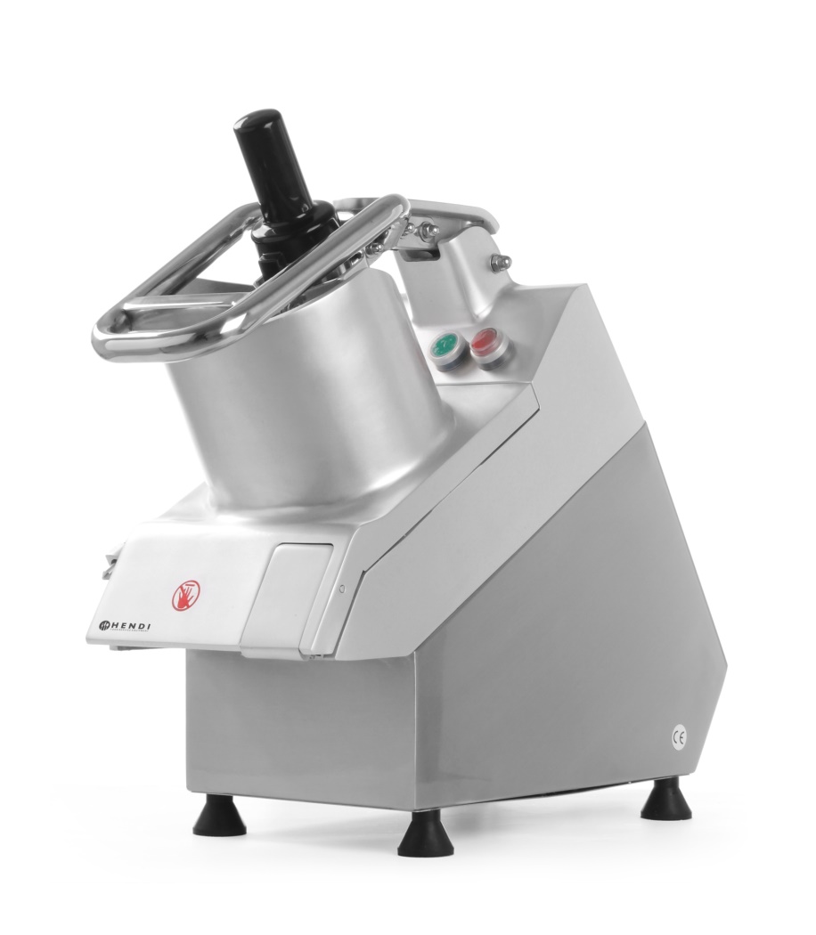 Progettata per il taglio di grandi quantità di verdure. Una apertura grande di carico per verdure fino a Ø 165 mm. Una apertura piccola per verdure lunghe come carote, cetrioli Ø 55 mm. Copertura della area di taglio in alluminio pressofuso, parte inferiore in acciaio inox. Comoda maniglia di pressione. Potente motore ventilato da 750 W = 1 CV. Pulsanti di controllo a bassa tensione STOP, START (24 V). 2 protezioni : l’arresto della rotazione dopo aver sollevato la maniglia di pressione e dopo aver sollevato la copertura superiore. La rotazione si avvia automaticamente dopo aver abbassato la maniglia di pressione. Cambio facile e veloce dei dischi di taglio. 5 dischi nel kit standard:fette di 2 mm (disco con 3 lame). fette di 4 mm (disco con 3 lame). grattugia di 3 mm. grattugia di 5 mm. grattugia di 7 mm. Il disco di evacuazione. 4 piedini antiscivolo in gomma. Velocità : 300 giri/min. Peso: 25 kg. ABS plastica. Acciaio inox. Alluminio.