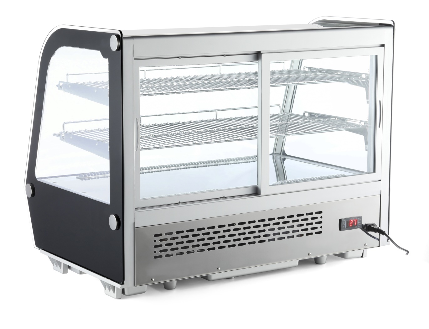Dotata di doppi vetri e vetro frontale curvo. Accesso tramite due porte scorrevoli posteriori. Struttura in acciaio inox. Dotato di illuminazione LED. Con 2 ripiani cromati regolabili in altezza. Regolatore di temperatura digitale e display. Sistema di raffreddamento ventilato con sbrinamento automatico. Campo di temperatura: 0/12 ° C. Refrigerante: R600a. Classe di clima: N. Acciaio inox. Chrome-plated. New.