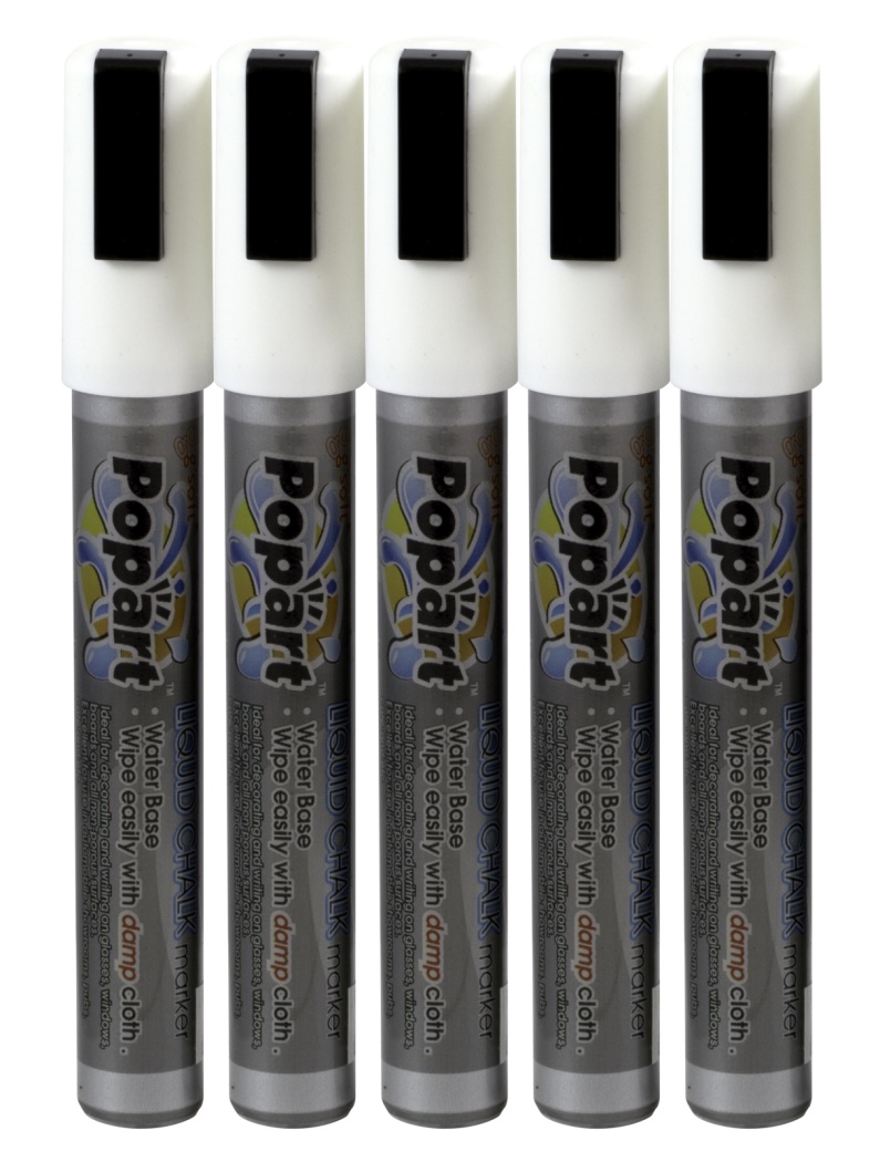 Descrizione:Penna a gesso con punta smussata, larghezza di scrittura da 2 a 6 mm.Colori: 5 pennarelli bianchi