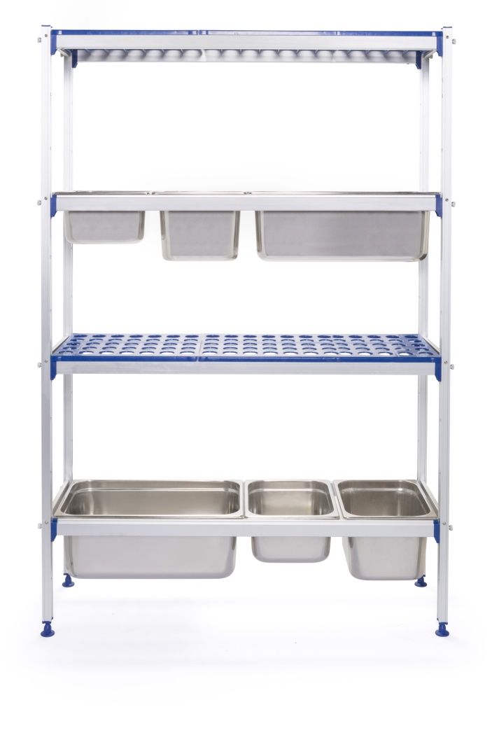 I contenitori GN si appoggiano direttamente tra i supporti in alluminio. Telaio in alluminio anodizzato. Con ripiani in polipropilene lavabili in lavastoviglie. Facili da montare. Consegna kit da montare. Portata massima distribuita sul ripiano 150 kg. Alluminio. Da montare. Polypropylene.