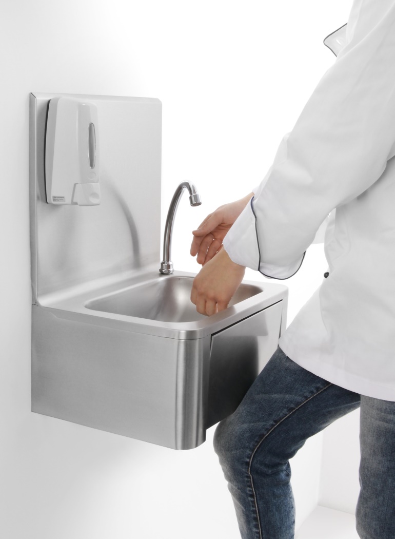 Lavamani con comando a ginocchio, erogatore e dispenser sapone - Hendi - 40 x 32 x H 20/57cm - acciaio inox - 810309