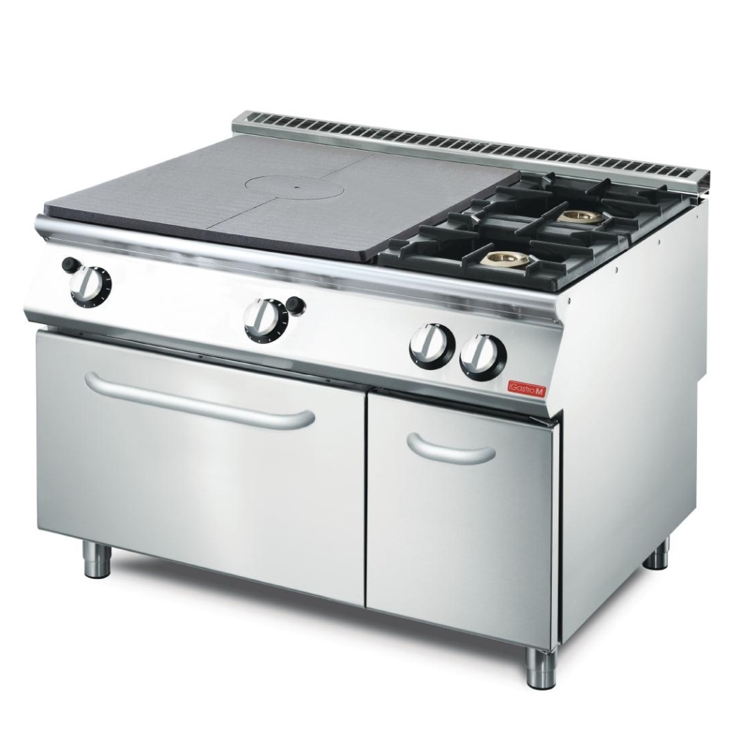 Piastra stufa con 2/4 fuochi e forno a gas. Bruciatore centrale sotto il piano cottura, 2 fuochi con accensione piezoelettrica, luce pilota e termocoppia. Forno a gas con cremagliere guidate rimovibili, termostato, termocoppia e accensione piezoelettrica.