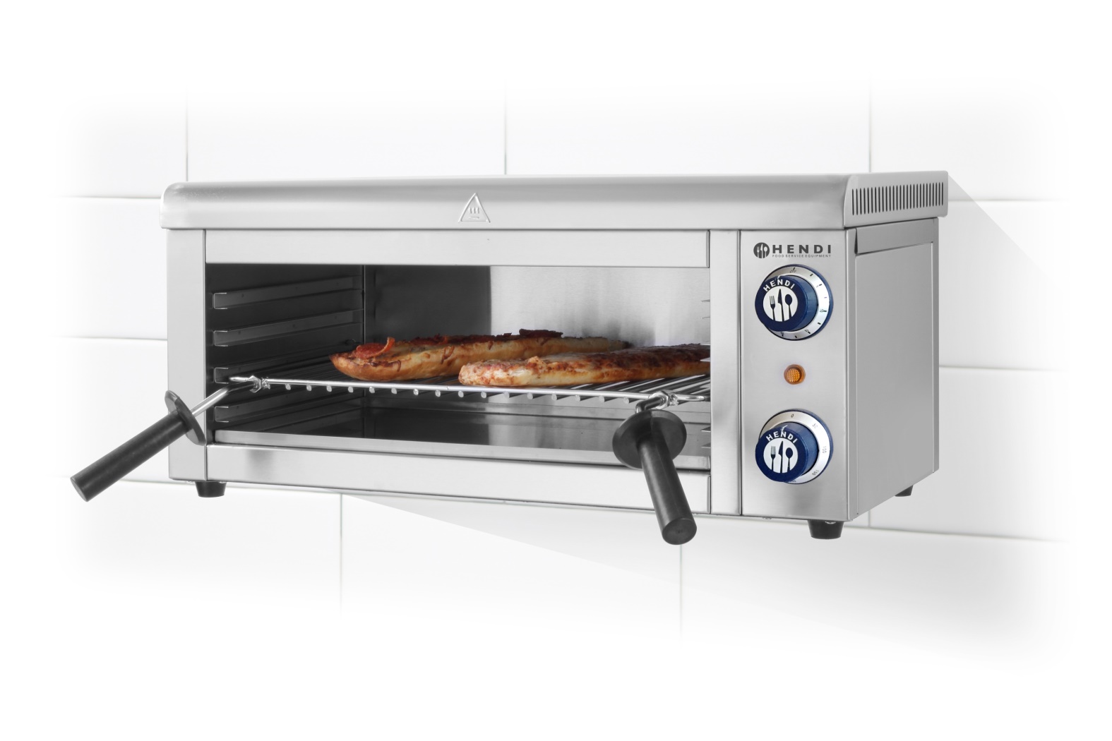 Conforme alle norme IPX4. Puo essere installata a muro senza mensole aggiuntive. Ideale per gratinare e scaldare pietanze e sandwiches. Temperatura regolabile da 50°C a 300°C. Con resistenze nella zona superiore. Dotata di regolatore della potenza,timer da 30 min.e lampada di controllo. 4 diverse altezze della griglia regolabili, maniglie isolate termicamente. Con teglia di recupero nella zona inferiore. Acciaio inox.