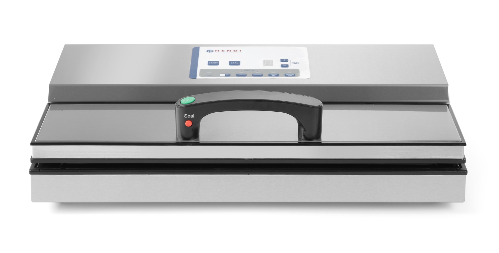 Barra saldante da 420 mm, larghezza della barra: 5 mm. Adatto per sacchi in rotoli in combinazione con accessorio per rotolo 970638. Display digitale del vuoto e del ciclo di tenuta. Il vuoto può essere generato in modo continuo o pulsante. Tasti aggiuntivi per un rapido avvio del vuoto e di tenuta sul manico. Spegnimento automatico dopo 10 minuti di inattività , risparmio energetico. Alto potere della barra saldante riduce il tempo di saldatura a 2-3 s. Tempo di saldature regolabile. Doppia pompa ad alta capacita´: 16L / min. Corpo in acciaio inox. Robusta maniglia. Accessorio per sacchetti in rotolo 970.638 disponibile. Solo per sacchetti sottovuoto di larghezza 406 mm goffrati. Peso: 6,9 kg. Acciaio inox.