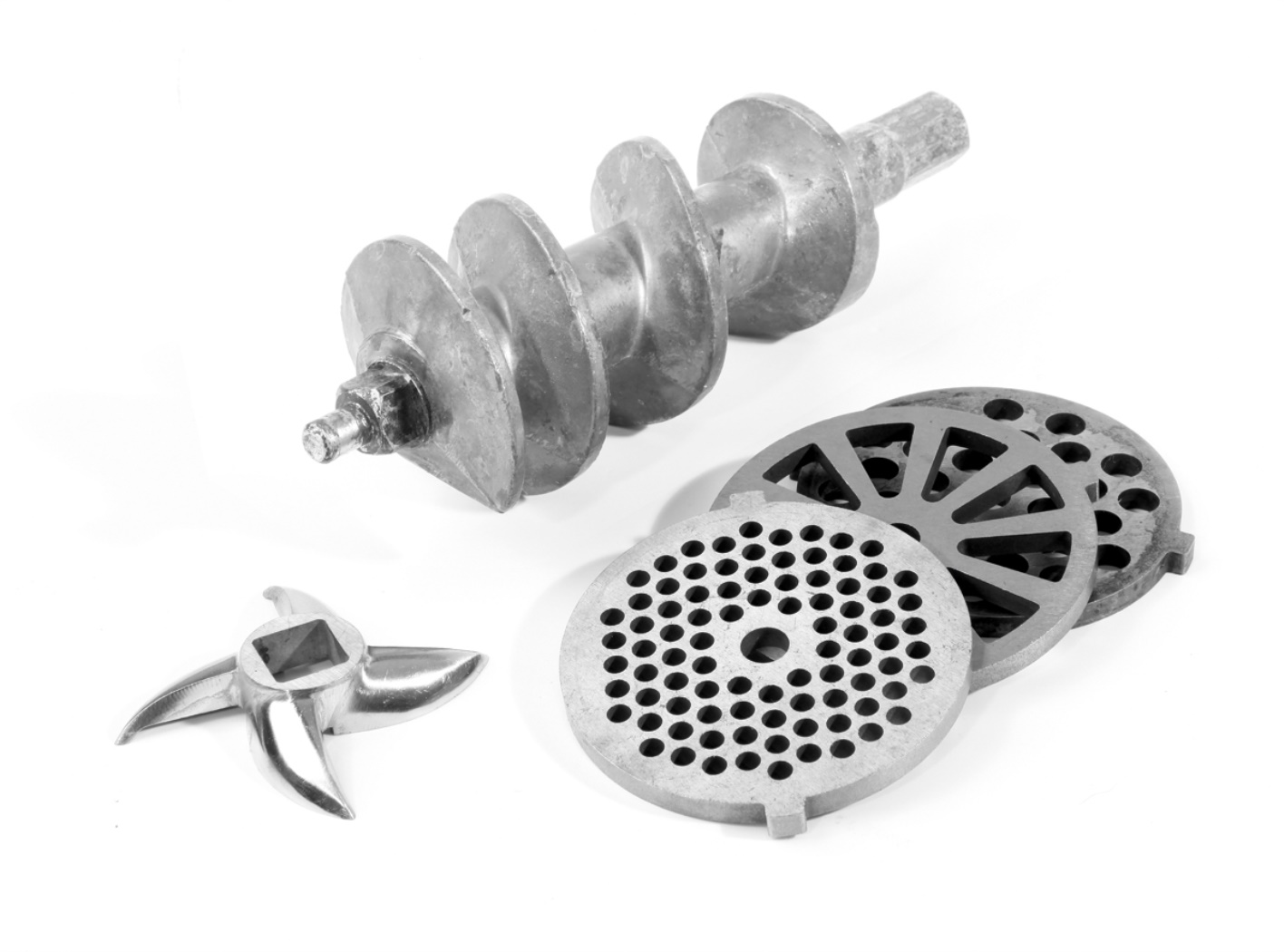 Ideale per la produzione di piccole quantita´di insaccati, non per uso commerciale. Struttura in alluminio. Tramoggia in metallo pressofuso con coperchio antipolvere. Pestello in plastica. Coclea in alluminio e coltello in acciaio. 2 dischi per taglio da 65,8 mm con fori da 4 mm, 7 mm di diametro. 3 imbuti per insaccati da ø 12, 15 e 20 mm. Accessorio per tartare. Interruttore acceso/spento/reverse. Non adatto per uso continuativo. Peso 5,2 Kg. Acciaio inox. Alluminio. Polietilene.