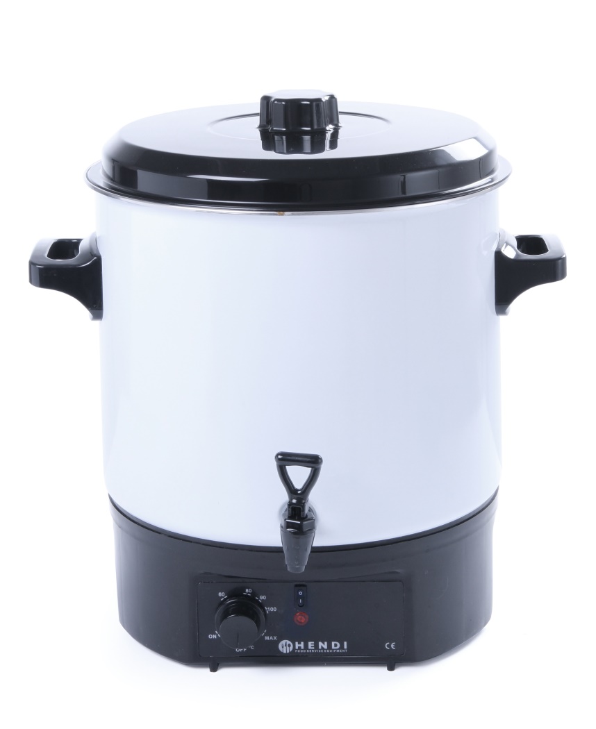 Bollitore smaltato. Manici isolati. Rubinetto anti goccia. Termostato regolabile fino a 90°C. Ideale per il vin brulé o acqua calda. Non adatto per cioccolata calda. Acciaio inox.27 liter230 V1800 W 460x480x(H)349 mm