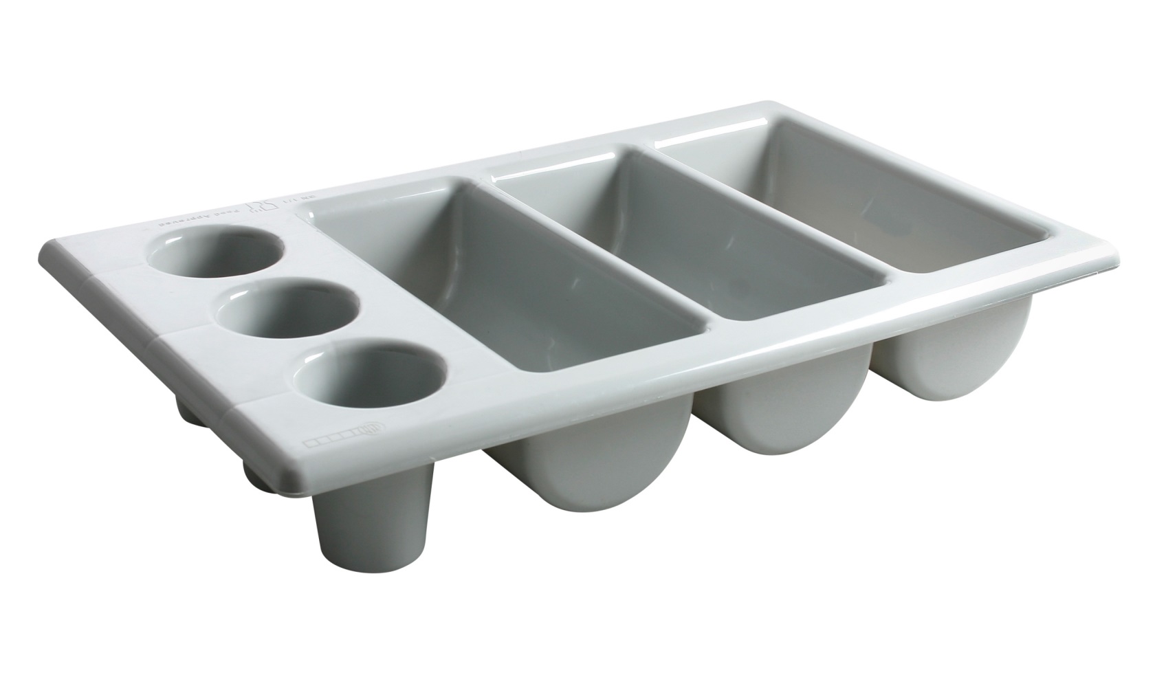 6 scomparti.Adatto anche per cucchiaini da caffè,cucchiaini e forchette da pasticceria.GN 1/1.Polipropilene.Ulteriori informazioni sul prodotto:53x32,5x (H) 10,5 cmColore grigio