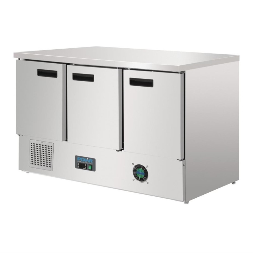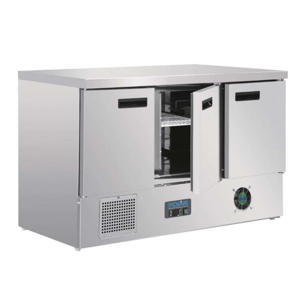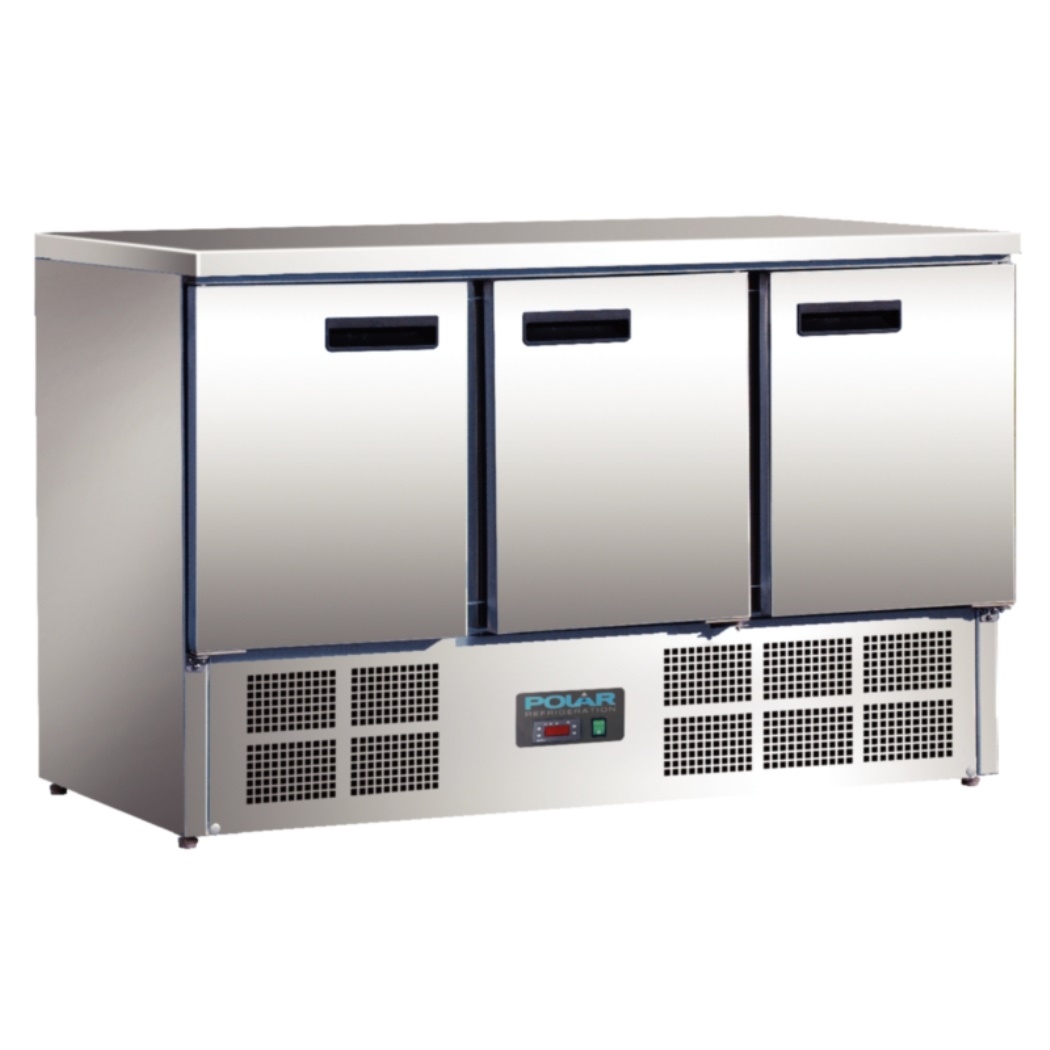 Banco da lavoro raffreddato con piano di lavoro in acciaio inox. Adatto per contenitori GN 6x GN 1/1 100 mm. Compressore salvaspazio nella parte inferiore. Controller completamente automatico con display digitale Sbrinamento regolabile con intervallo di tempo. È necessario uno sbrinamento manuale temporaneo. Senza CFC.