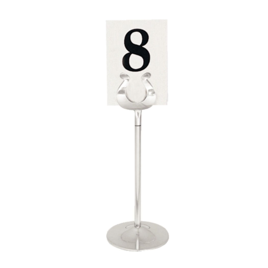 Supporti in acciaio inox e numeri in PVC per una facile identificazione dei tavoli nei ristoranti e nei caffè.Portatarga da 20 cm. Dimensioni: 20.5