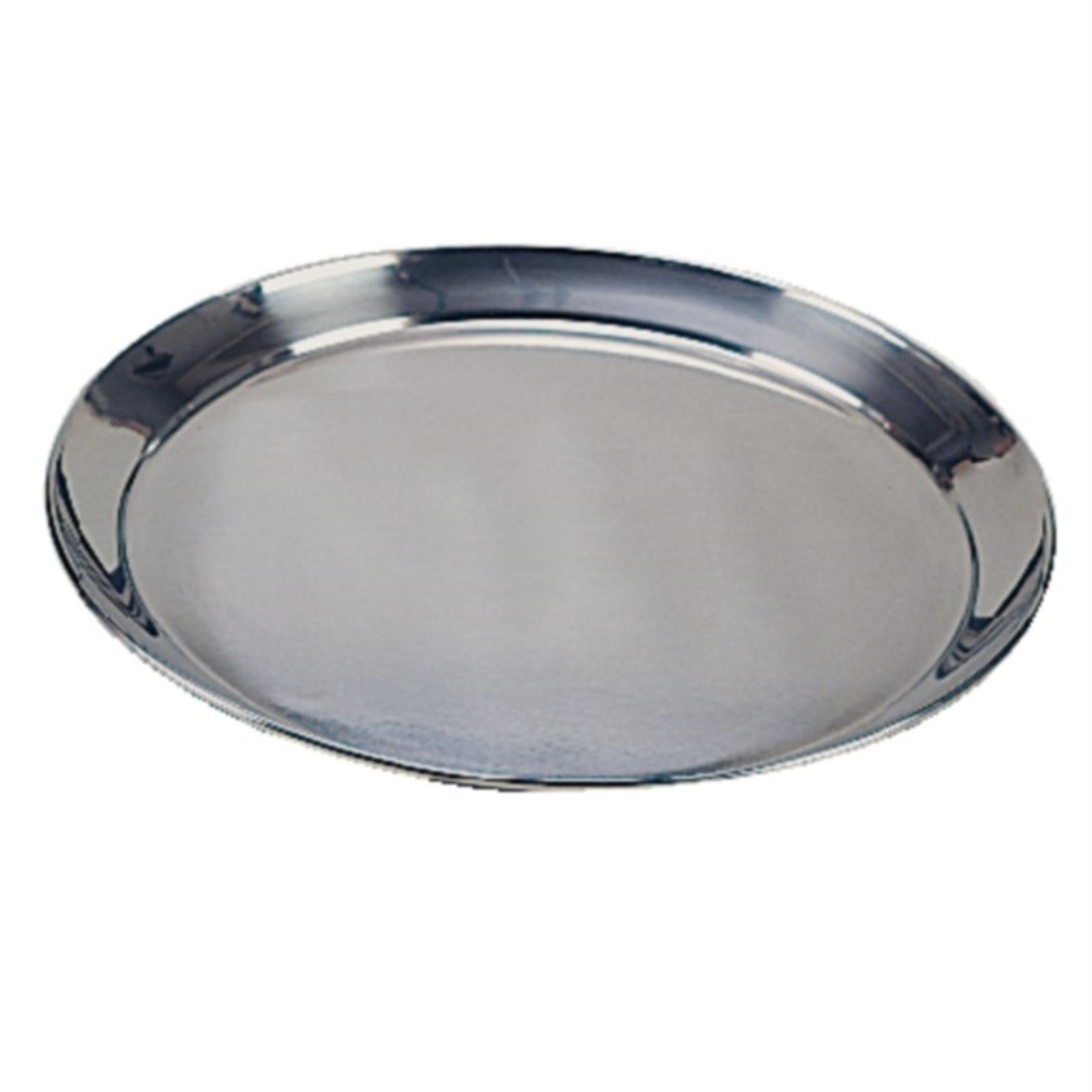 Vassoio rotondo in acciaio inossidabile con bordo rialzato.