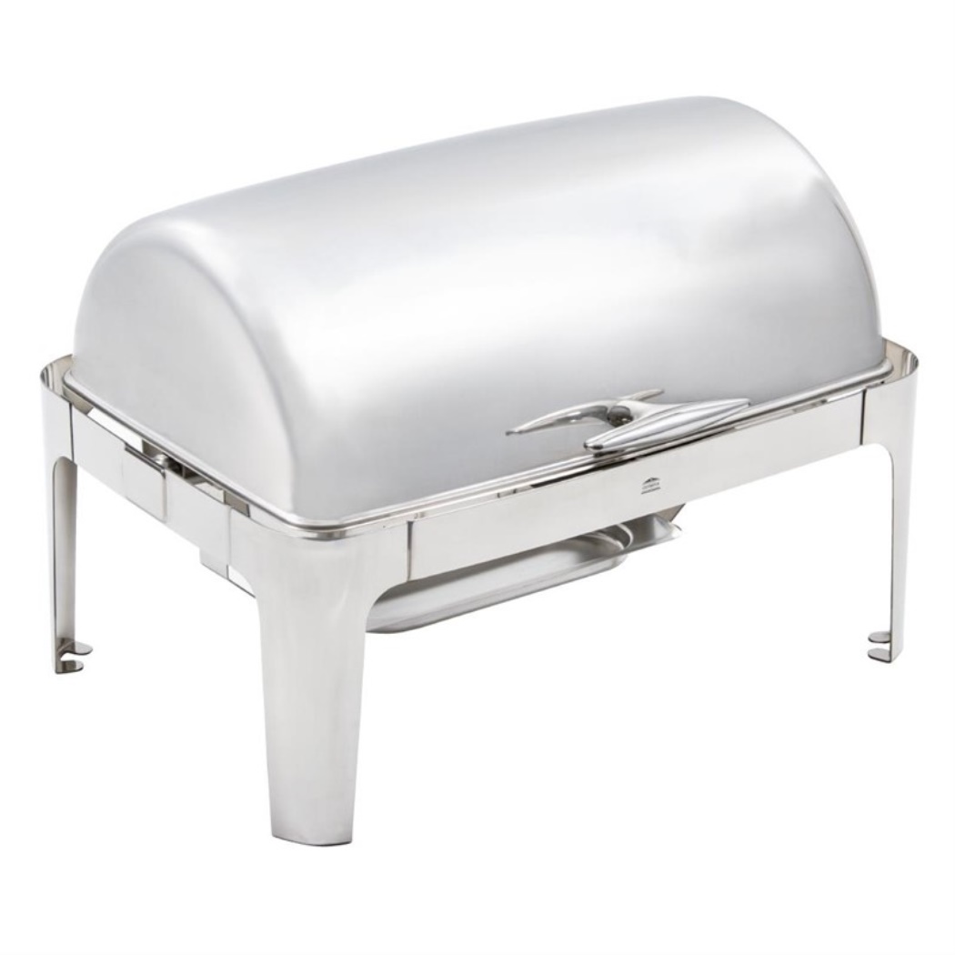 Scaldavivande GN 18/8 in acciaio inox lucidato con coperchio superiore. Completo di vaschetta per l'acqua, vaschetta per alimenti, coperchio e due contenitori per pasta per bruciatori. Dimensioni 44 (h) x 67,5 (b) x 53 (d) cm.